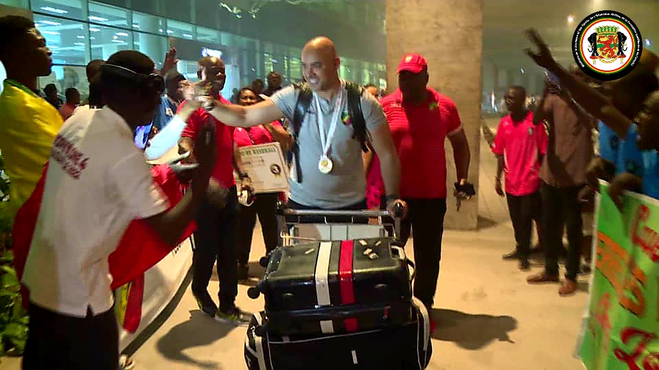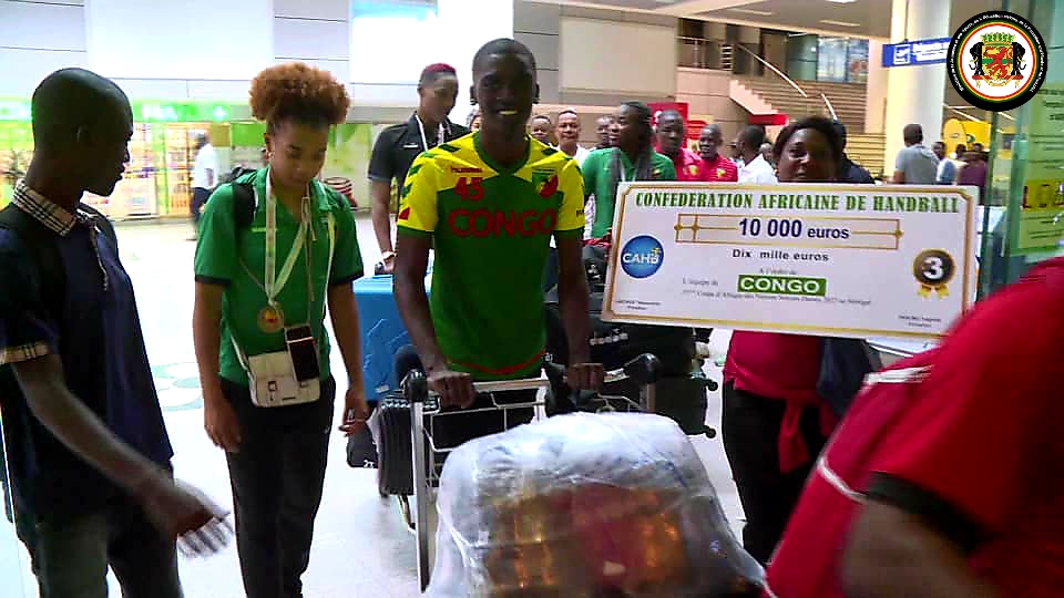 C’est aux alentours de 19H que l’avion des médaillées de bronze au Championnat d’Afrique des Nations féminin de handball 2022 a foulé le tarmac de l’aéroport MAYA-MAYA à Brazzaville. Les diables rouges ont été acceuillis par le Directeur de Cabinet du Ministre des Sports Congolais Charles MAKAYA DIT MACKAILL.