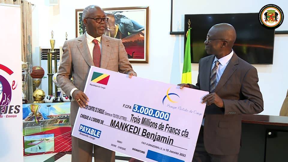 Le meilleur de tous, Mr MANKEDI Benjamin a reçu 3 millions de francs CFA des mains du ministre de la Jeunesse et des sports de l’éducation civique de la formation qualifiante Hugues NGOUELONDELE.